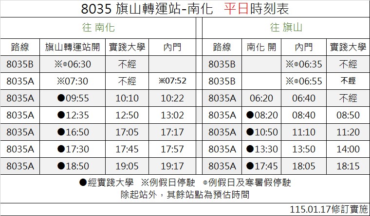 1/17起,8035路線及時(shí)刻表調(diào)整