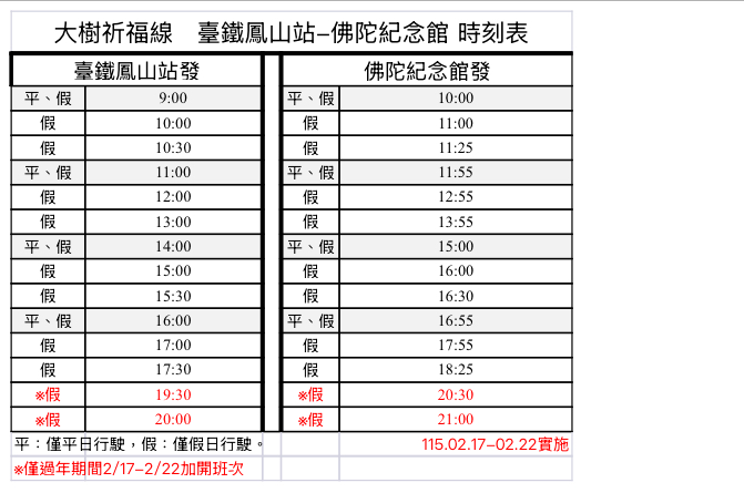 大樹祈福線,1150217-0222時(shí)刻表實(shí)施